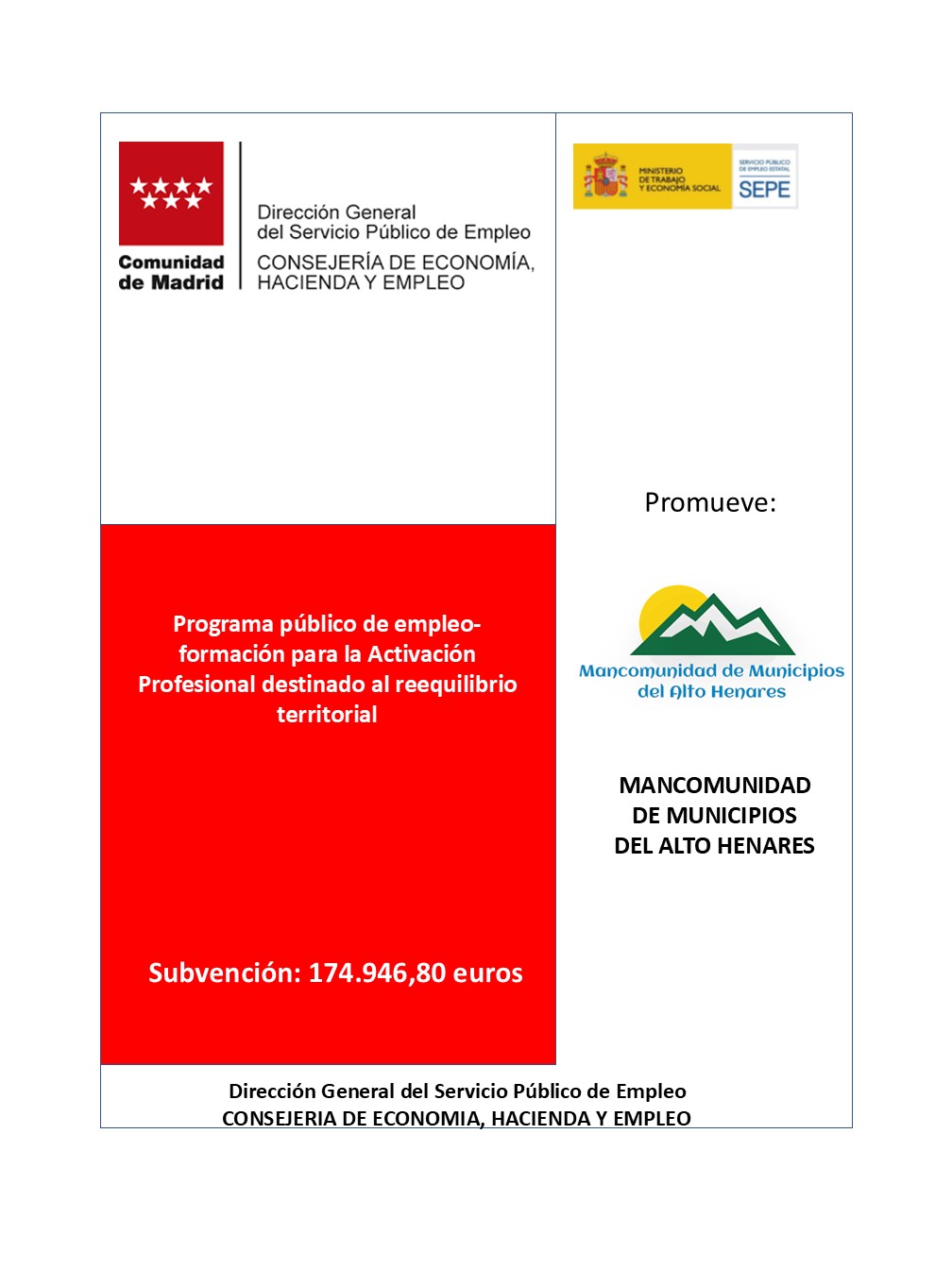 L a Mancomunidad de municipios del Alto henares ha recibido subvención programa público de empleo-formación para la Activación Profesional destinado a revertir el despoblamiento en los municipios rurales 2025 por cuantía de 239.732,16 € para la contratación de un total de 8 trabajadores que desarrollaran su trabajo en los municipios de Anchuelo, Santorcaz, Pezuela de las Torres, Valverde de Alcalá y Corpa durante 12 meses. Los puestos contratados se corresponden a 1 arquitectos, 1 jardineros, 3 barrenderos, 1 albañil, 1 pintor y un Técnico de Medio ambiente.